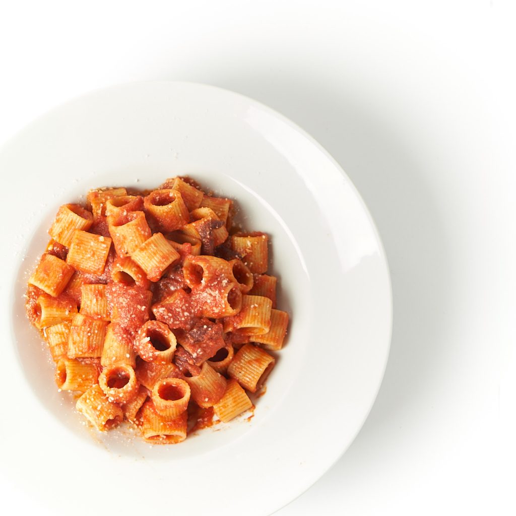 Rigatoni con tomate San Marzano, guanciale y queso pecorino